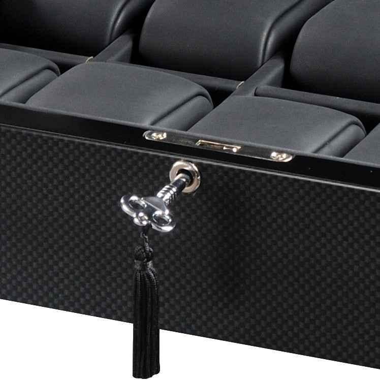 This Volta 10-compartment watch case is a perfect combination of style and functionality, designed to store and display your most prized timepieces. The exterior is crafted from genuine carbon fiber wood, providing a sleek, modern look, while the plush black leather interior protects your watches from scratches and damage.